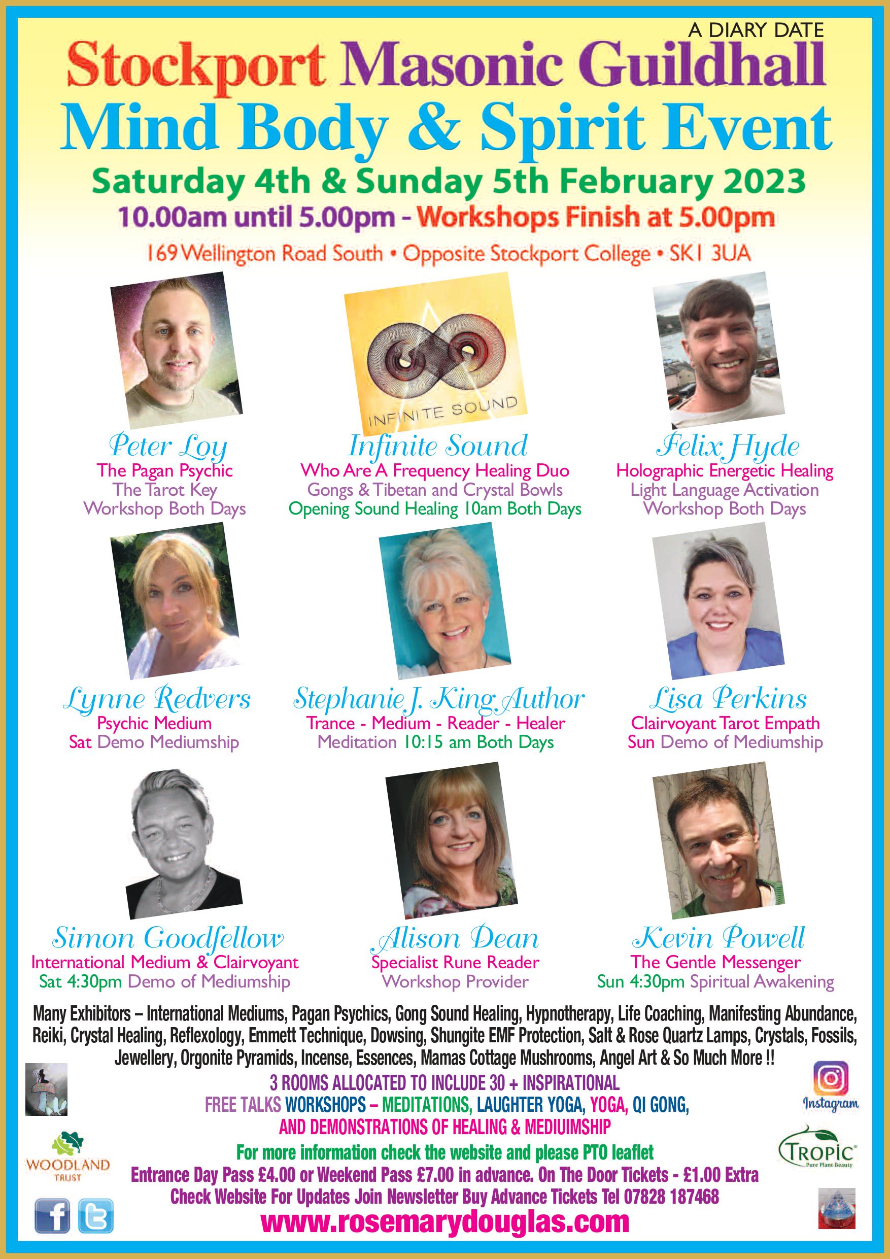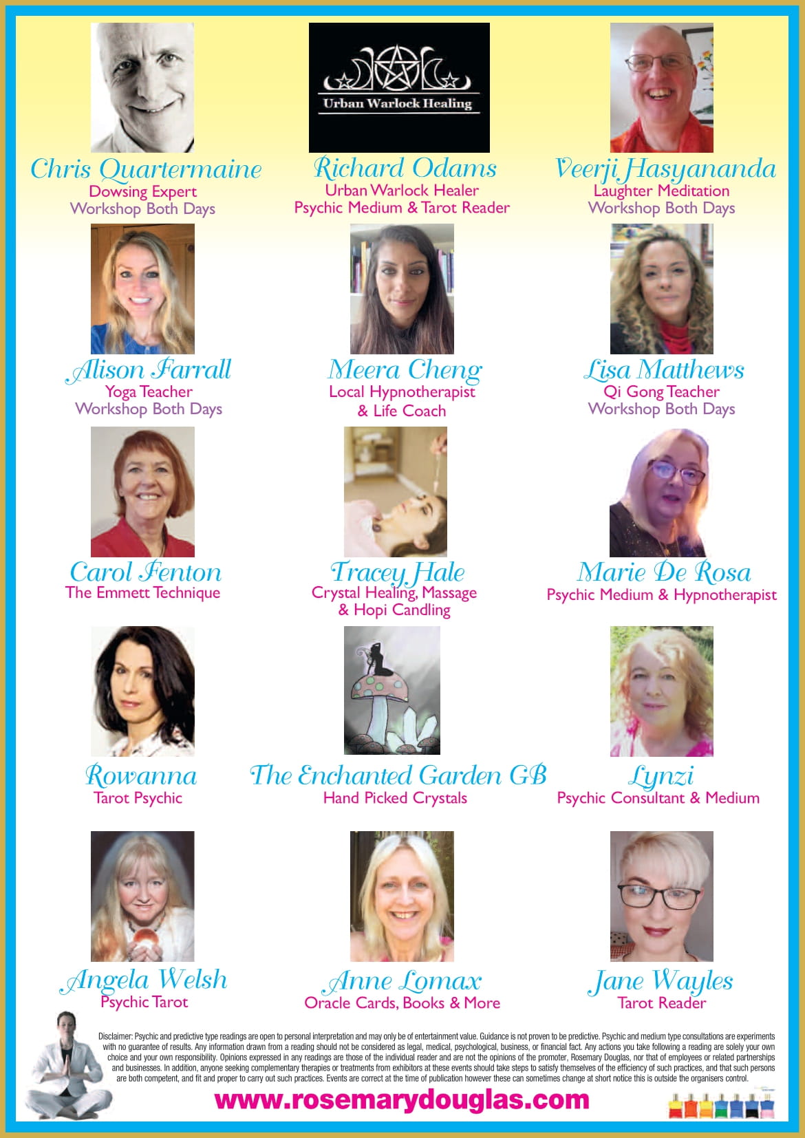 International Mediums Simon Goodfellow, Trance – Medium – Reader – Healer Stephanie J. King, The Pagan Psychic Peter Loy, Clairvoyant Tarot Empath Lisa Perkins, The Gentle Messenger Kevin Powell, Psychic Medium Lynne Redvers, Psychic Medium Marie De Rosa, Psychic Tarot Angela Welsh, Tarot Reader Jane Wayles, Tarot Psychic Rowanna, Spiritual Consultant Medium Lynzi, Richard Odams The Urban Warlock Healer Psychic Medium & Tarot Reader.